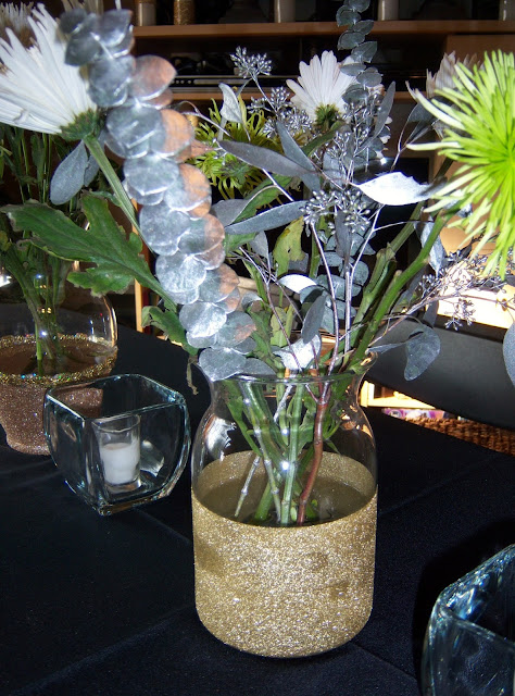 You can also use a piece of trim from the fabric store & hot glue it around the vase at the edge of the glitter, particularly if while removing the tape you end up a bit uneven.